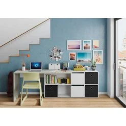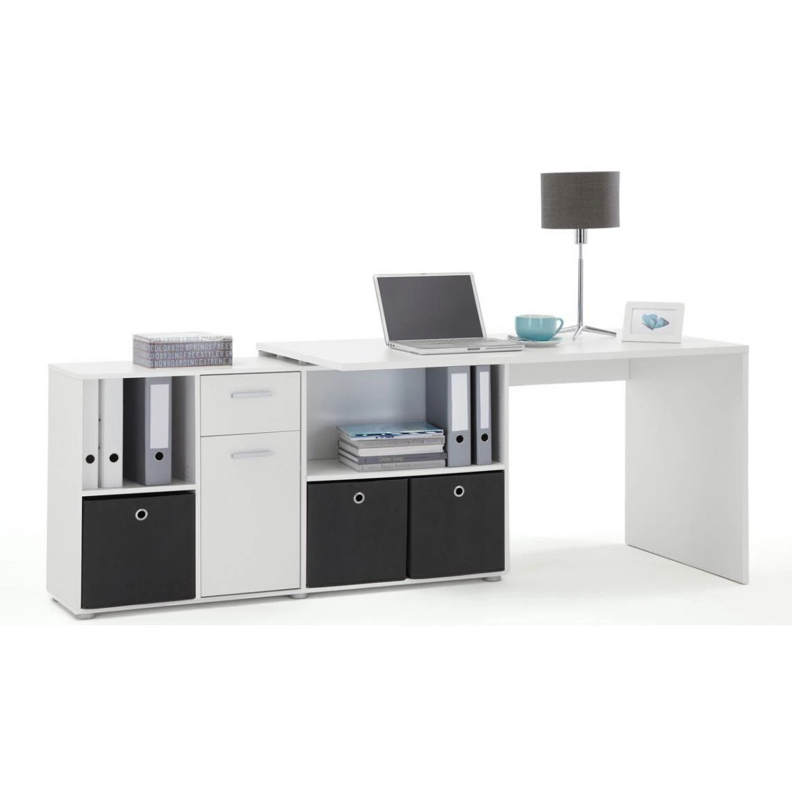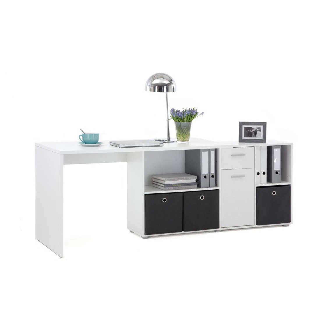 Bureau d’angle réversible avec 4 compartiments ouverts, une porte et un tiroir pour un rangement optimal.