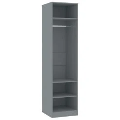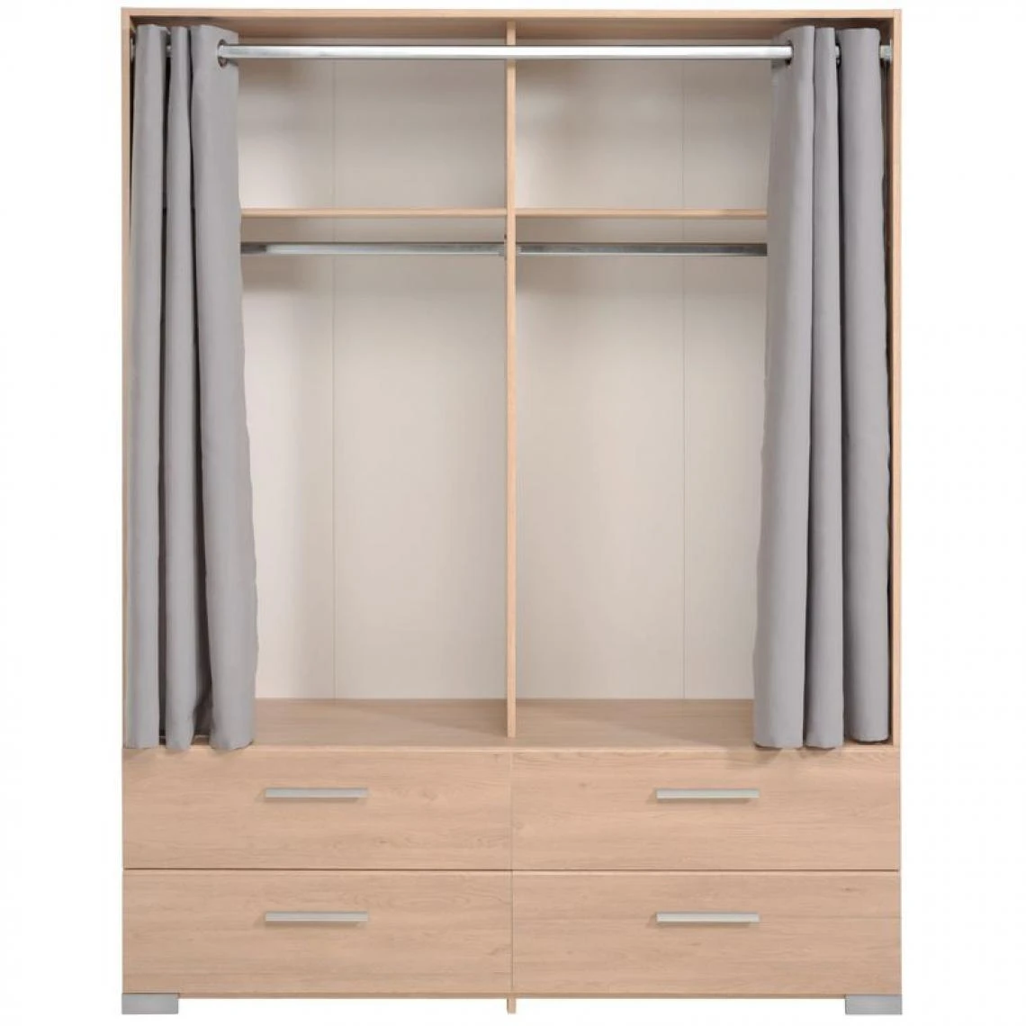 Pieds :2 faux pieds en ABS déco alu mat. . Chants :mélaminés imitation chêne nature. 4 tiroirs. . Tiroir :4. . Comprend :1 barre de penderie, 1 étagère haute et 4 tiroirs. . Finition :papier décor imitation chêne. . Garantie :2 ans , Pièces. . Poignées :en ABS décor alu mat. Coulisses à billes. 1 barre avec 2 rideaux à oeillets 100% polyester décor gris. . Structure :en panneaux de particules revêtus papier décor imitation chêne et gris alu sur le fond. . Dimensions en cm :L. 152,7 – H. 202,8 – P. 56,5 cm. . Dispo pcs détachées donnée fournisseur :NC. .