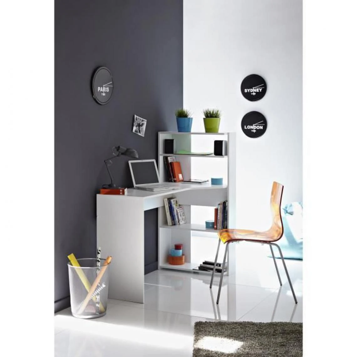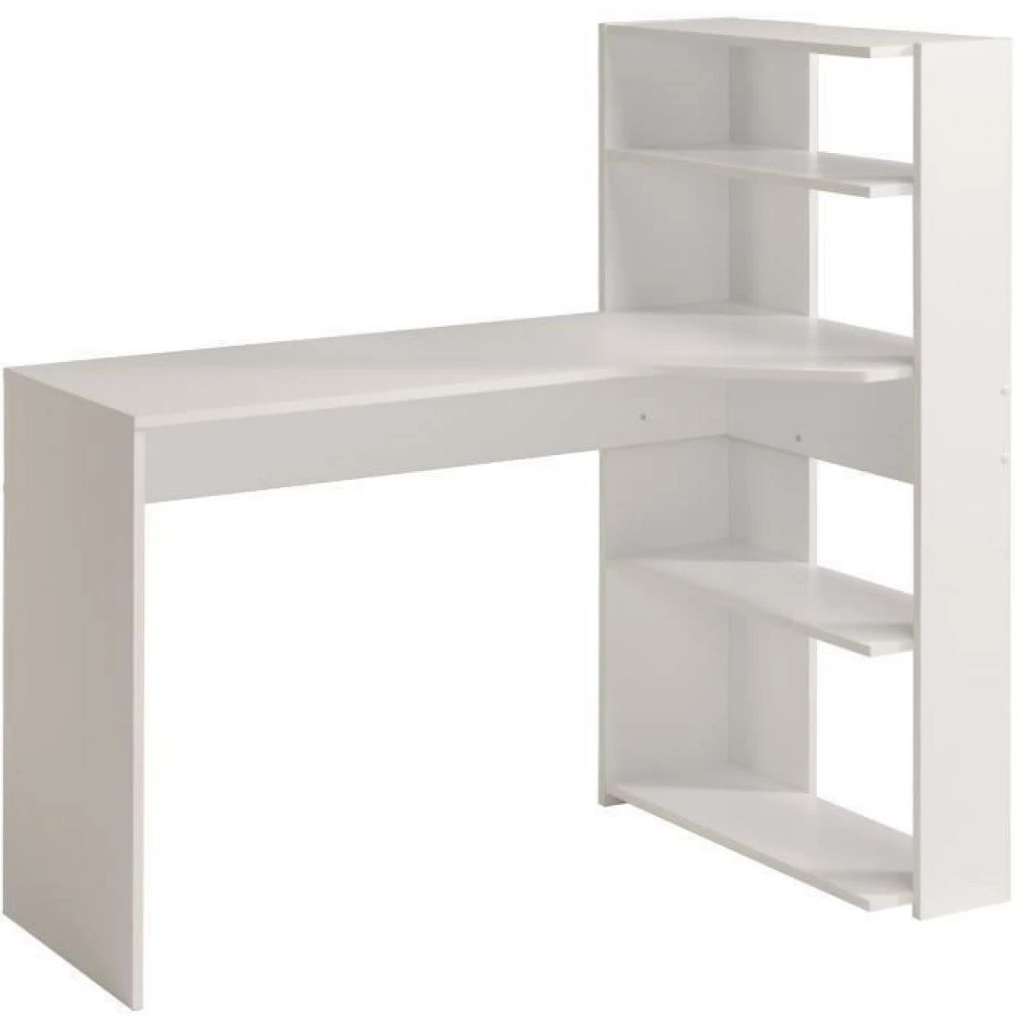Teinte :Blanc . Finition :Revêtu de papier décor blanc . Garantie :Garantie : 2 ans, pièces . Plateau :Plateau de 120 cm avec découpe en forme . Tablette :1 espace bibliothèque H.121 x l.24 cm . Structure :En panneaux de particules d’épaisseur 15 mm . Piètement :Panneaux de particules . A monter soi-mêmeOui . Dimensions en cm :L.122 x H.121,5 x l.64,5 cm . Dispo pcs détachées donnée fournisseur :2 ans .