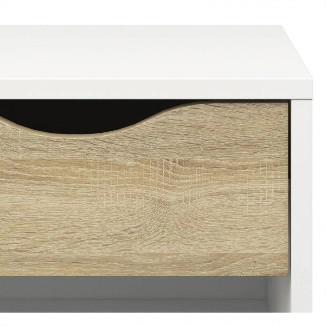 Structure :Panneaux de particules. . Pieds :chêne massif. . Tiroirs :1 tiroir et 1 niche. . Teinte :Blanc et imitation chêne. . Finition :Papier décor blanc et imitation chêne structuré. . Dimensions en cm :L. 50,1 – H. 49,7 – P. 39,05 cm. . Dispo pcs detachees donnee fournisseur :NC. . A monter soi-meme. . Garantie :2 ans , Pièces. .