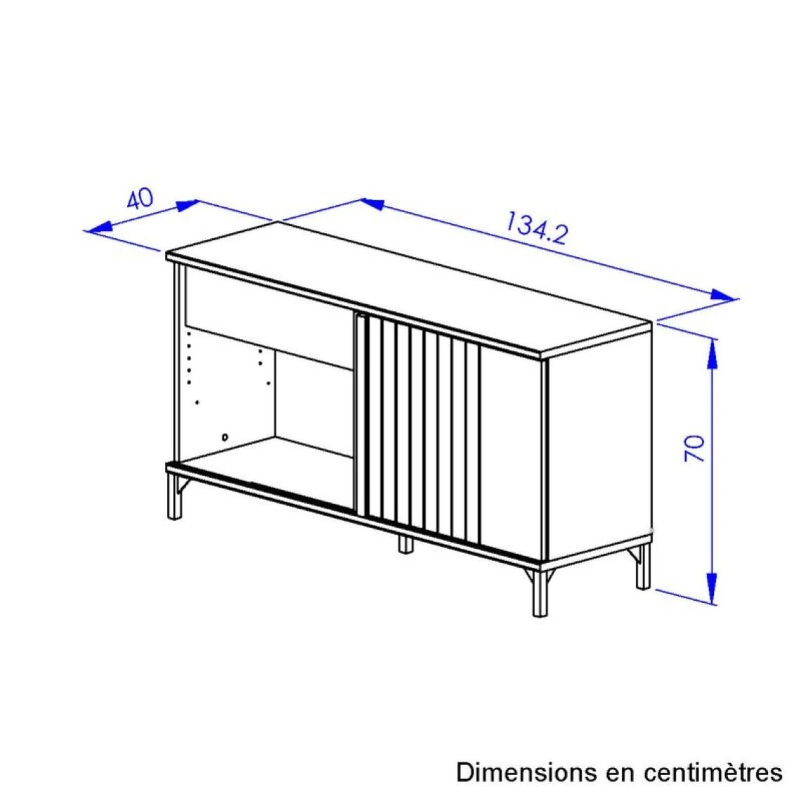 Pieds :ABS noir mat. . Finition :papier décor imitation chêne blond et impression numérique filets noirs sur la façade porte coulissante. . Garantie :2 ans , Pièces . Poignées :profil enrobé imitation chêne blond. . Structure :panneaux de particules. . A monter soi-même. . Dimensions en cm :L. 135 – H. 70 – P. 40. . Dispo pcs détachées donnée fournisseur : 2 ans .