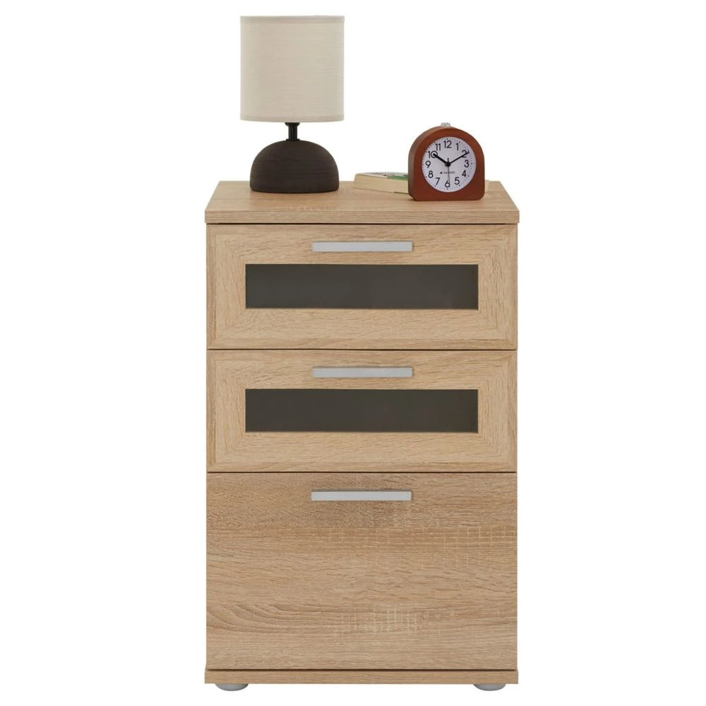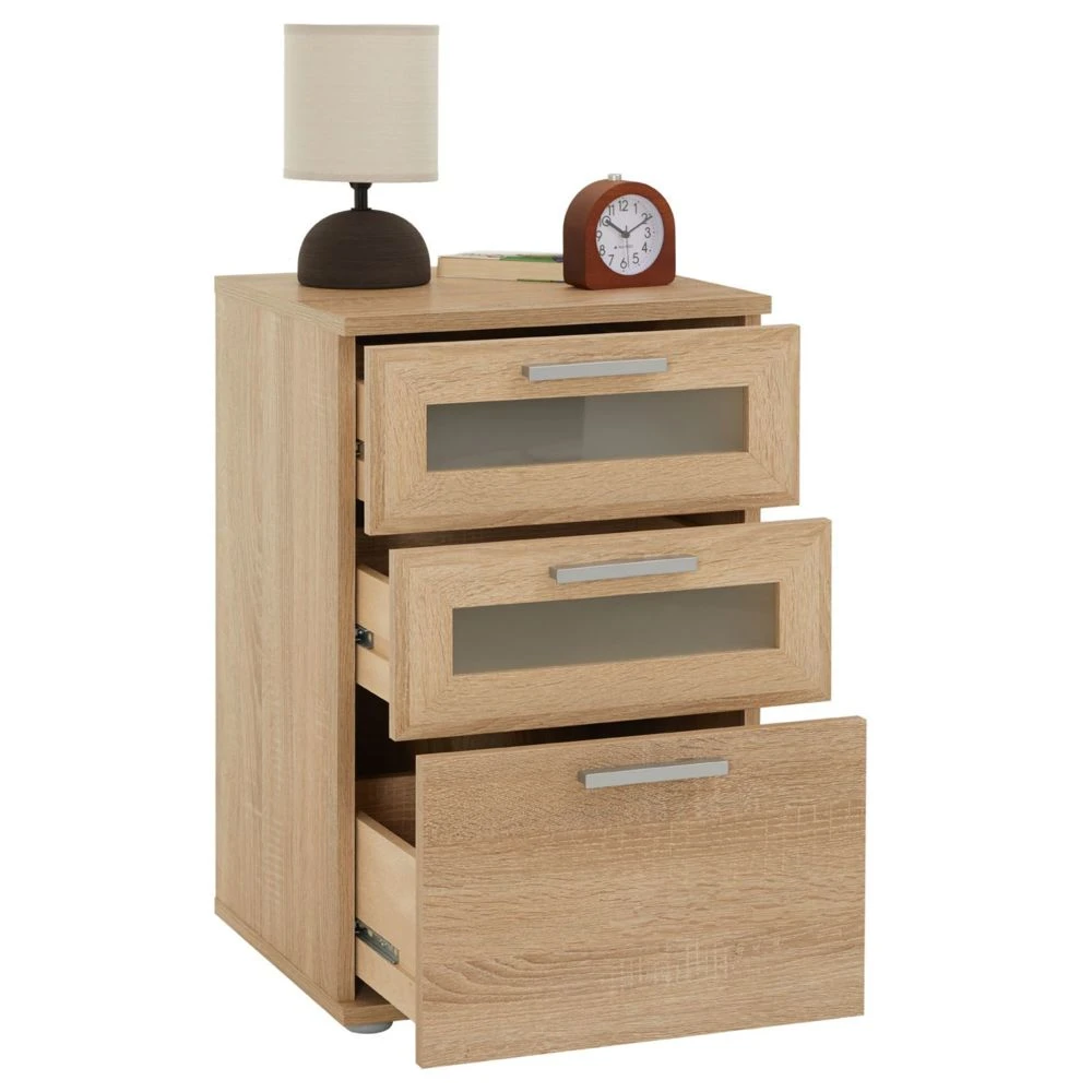 – La table de chevet est fabriquée à partir de panneaux de particules de bois, recouvert d’un mélaminé au décor chêne sonoma.