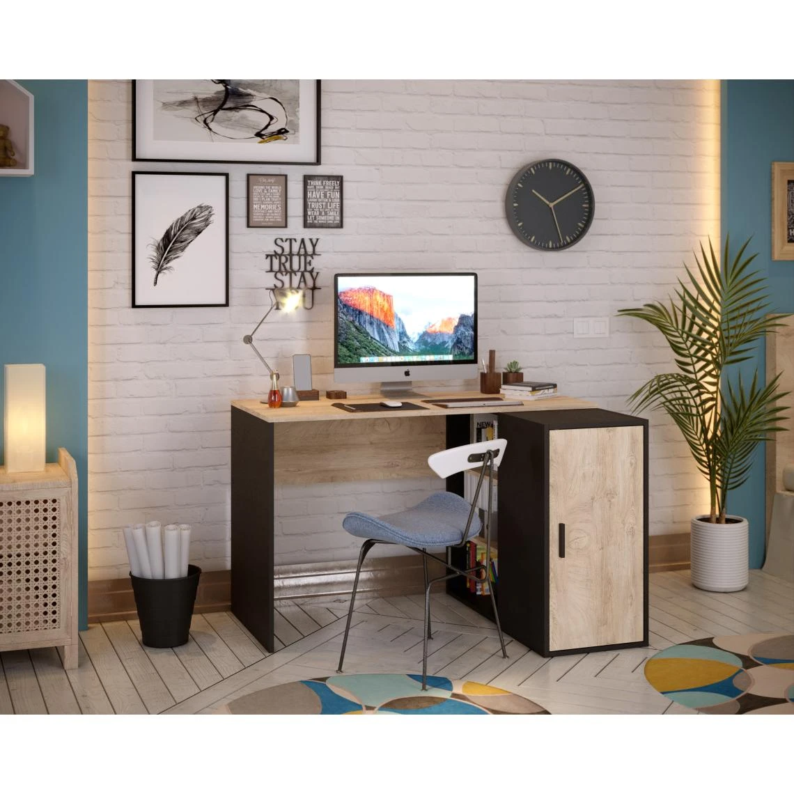 Bureau d’angle droit fabriqué en panneaux de mélamine 16 mm effet chêne et noir , équipé d’une porte et 5 étagères