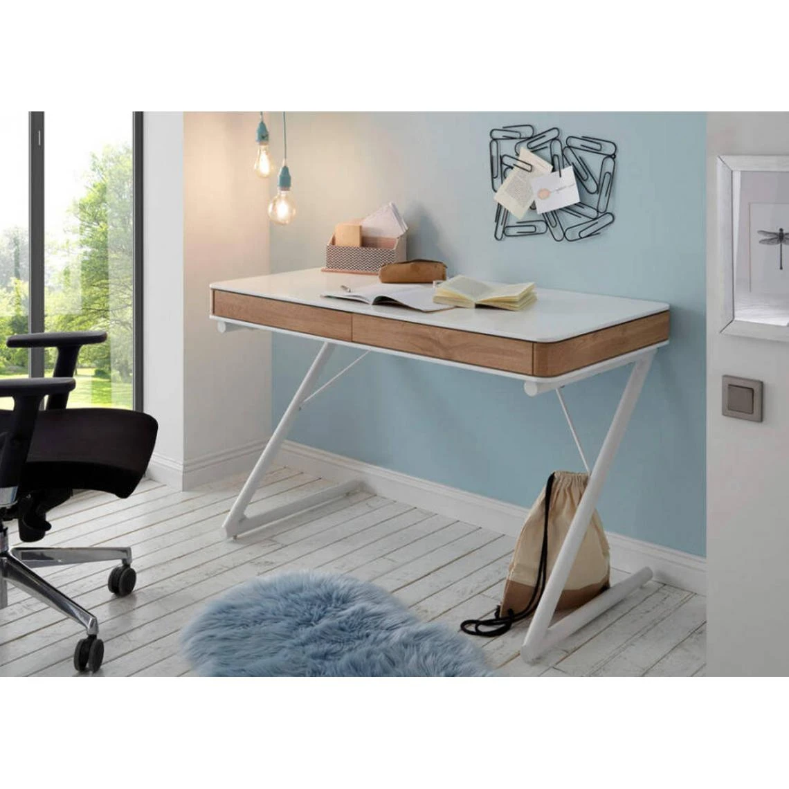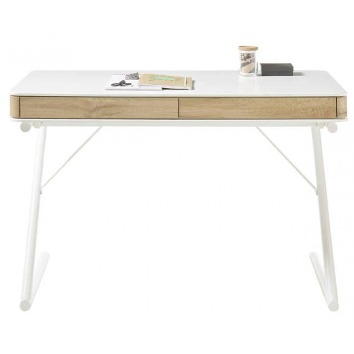 Bureau modern avec deux tiroirs, vernis blanc mat, feuille de chêne, structure en métal. enduit de poudre, blanc brillant
