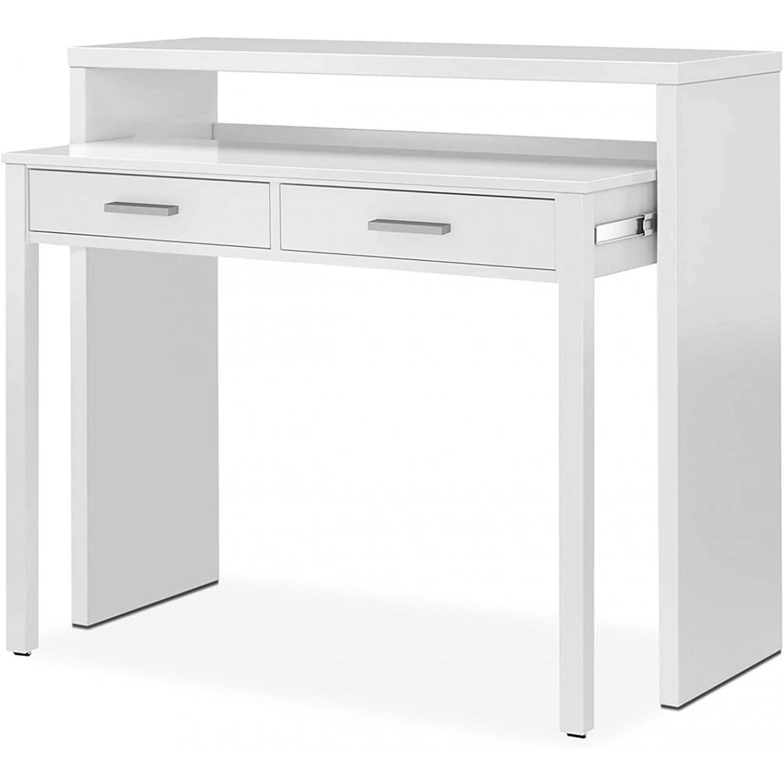 Table console extensible convertible en bureau informatique design contemporain et meuble multifonctionnel, idéal pour les petites pièces,pour ajouter une touche de modernité et d’élégance dans votre chambre ou bureau! Matériaux : panneaux de particules mélaminés coloris blanc Artik. .Produit de fabrication Espagnol certifié PEFC.