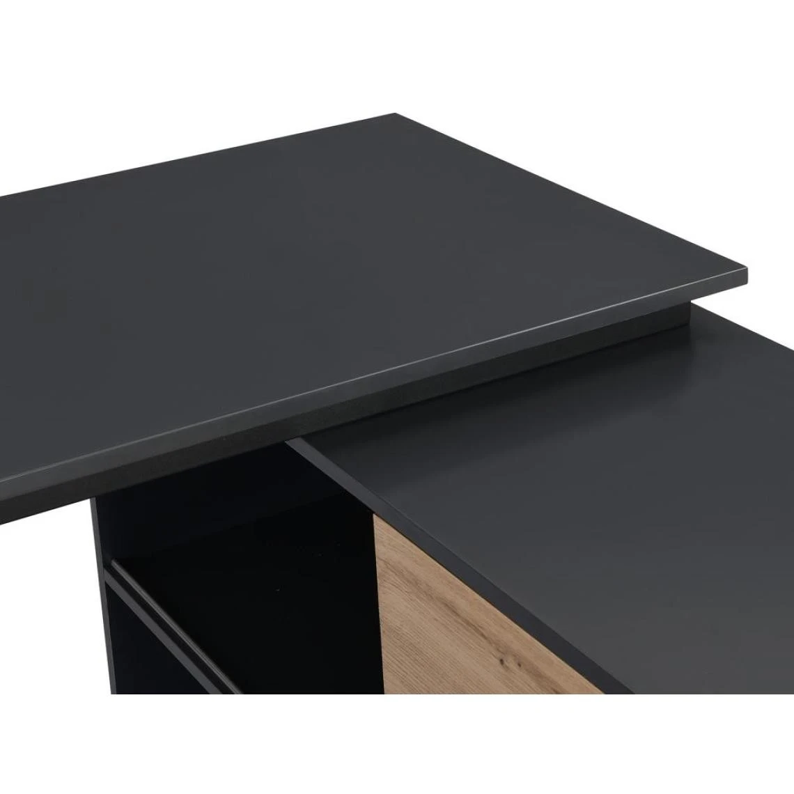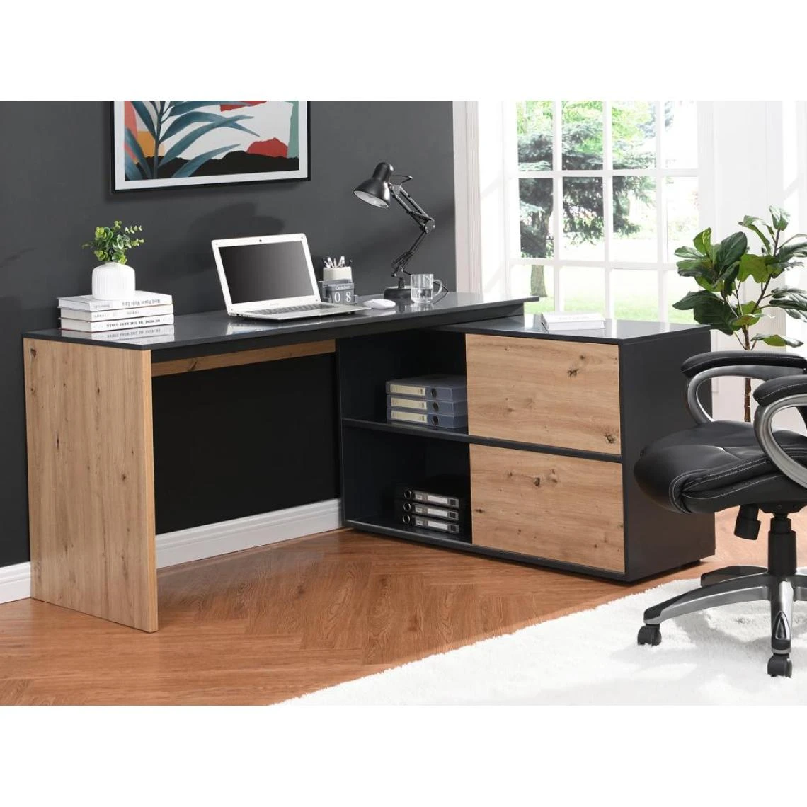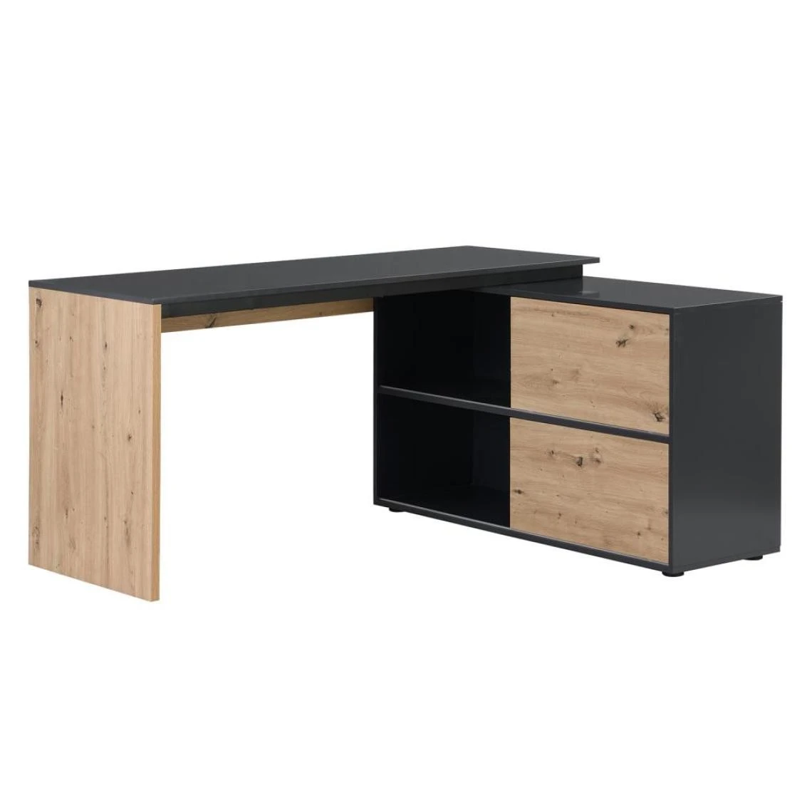 Ce bureau d’angle se démarque par ses deux grands espaces de rangement qui se referment grâce à des portes coulissantes. D’inspiration contemporaine, ce bureau d’angle présente un aspect bicolore naturel et noir très tendance et dispose d’un design fonctionnel qui vous permettra d’organiser facilement votre espace de travail.