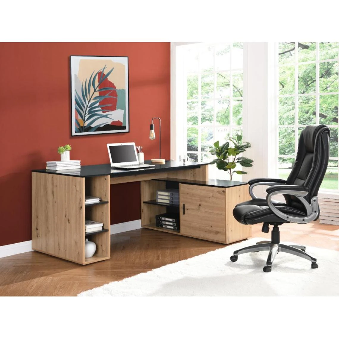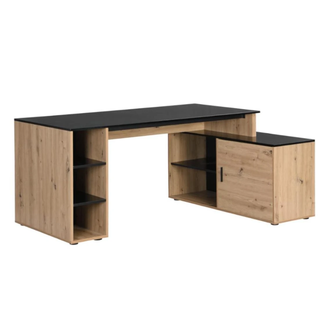 Le bureau d’angle ROMIARA saura vous convaincre grâce à ses 5 niches et son placard intégré, parfait pour un espace de travail ordonné ! De couleur naturel et noir, ce bureau apportera de la modernité à votre pièce.