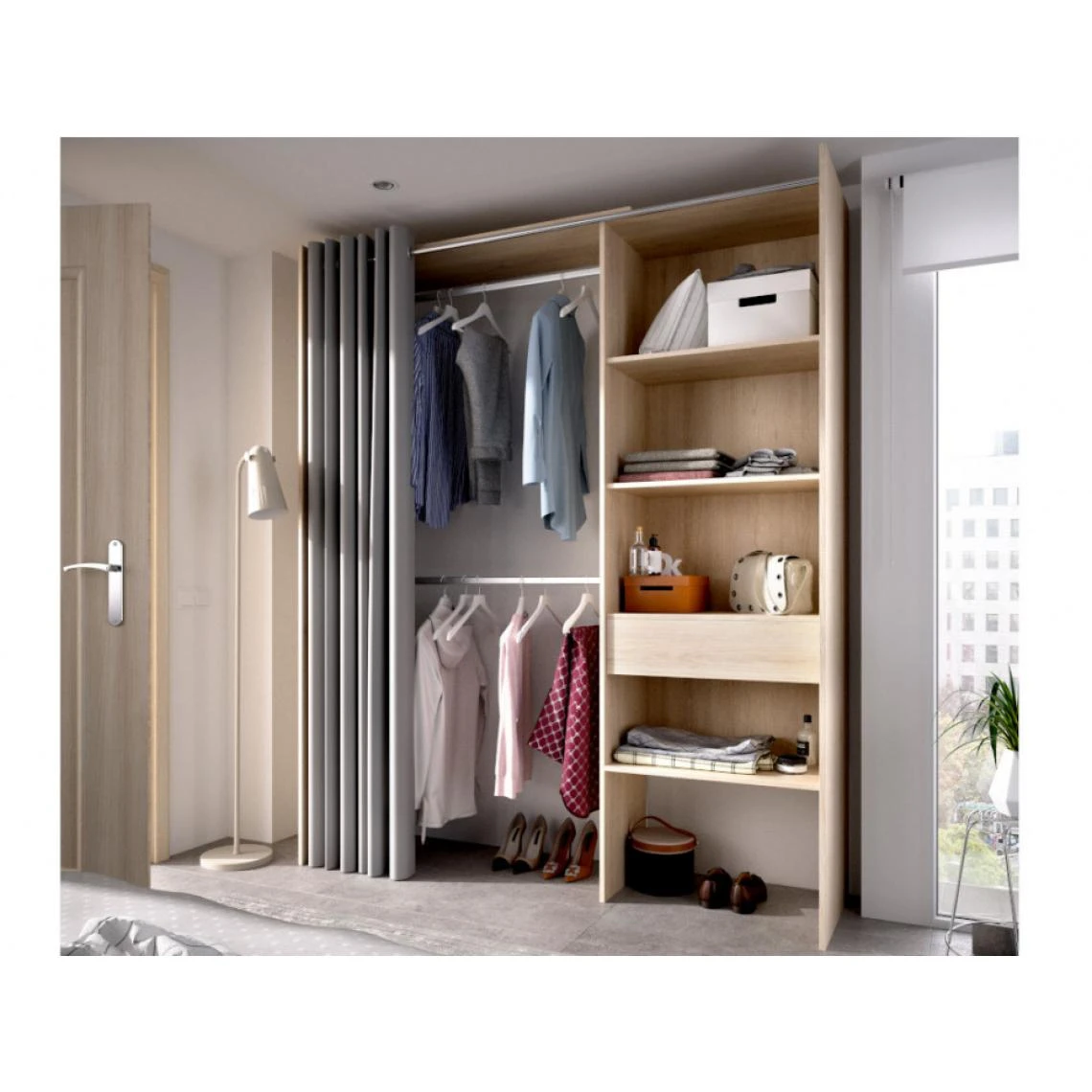 Le dressing LAURENT est composé d’une double penderie et d’une lingère regroupant 4 étagères et un tiroir. Ces nombreux rangements vous permettront de ranger efficacement l’ensemble de vos affaires et son rideau gris apportera un touche de modernité à votre pièce. Pratique et moderne, le dressing LAURENT sera votre allié au quotidien.