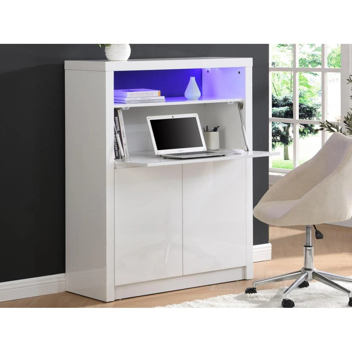 Points forts Vente-Unique Secrétaire avec 2 portes – Avec LEDs – MDF – Blanc lacqué – MELIONA